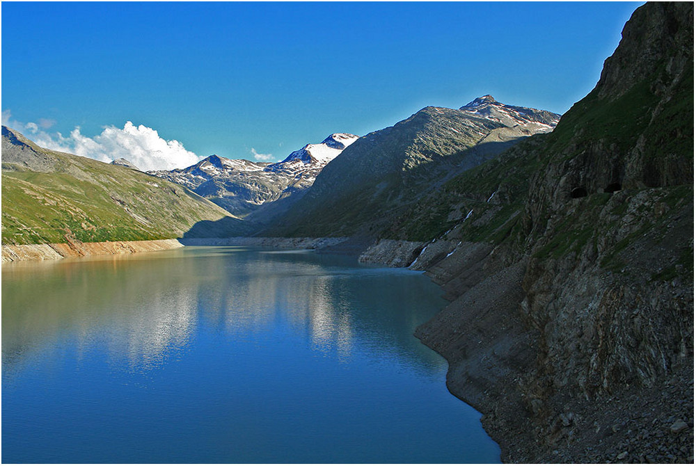 Au départ du barrage, un chemin à plat fait le tour du lac en 2h30, en passant par Distelalp.