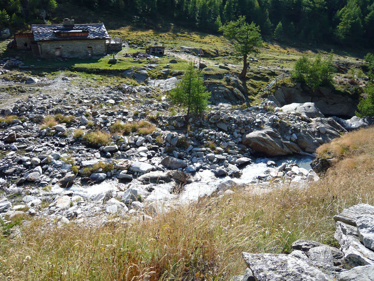 Folgen Sie nicht diesem Tal, das bis zum Antronapass führt, sondern überqueren Sie den Fluss über die kleine Brücke. Nach einer kurzen Steigung gelangen Sie zum Weiler Furggu (2.075m), dem Höhepunkt dieser Wanderung. Etwa hundert Meter nach diesem Weiler befindet sich an einem wunderbaren Ort eine Bank, die zum Ausruhen und Innehalten einlädt.