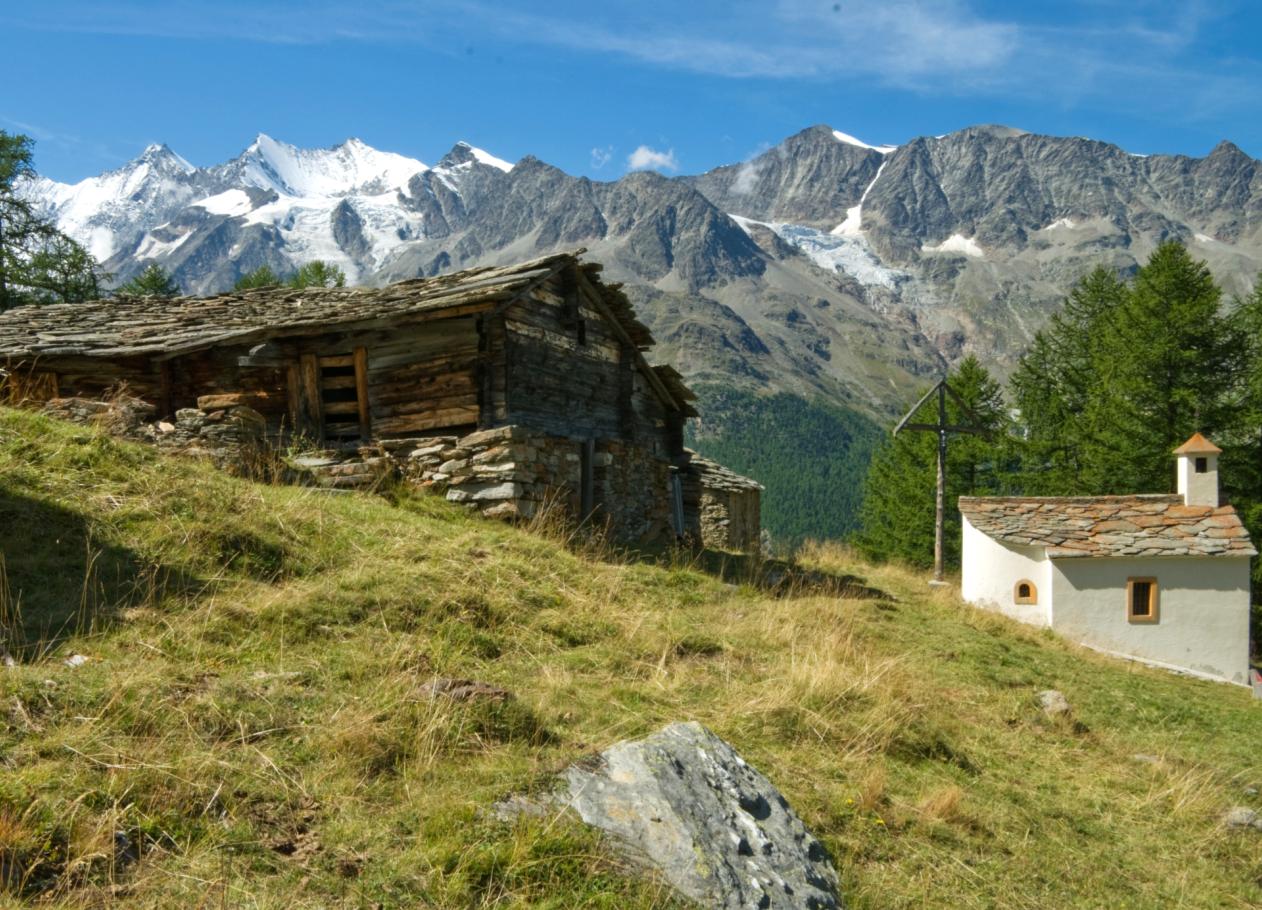 Aus Saas-Grund gehen Sie den leicht aufsteigenden Waldpfad bis zum alten Weiler Triftalp mit seiner Kappelle